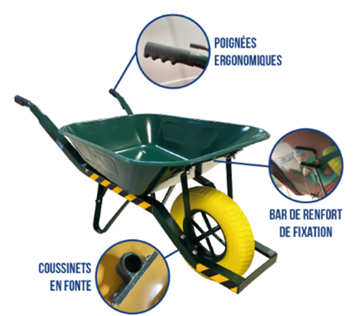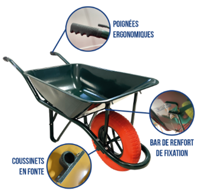 BROUETTE RÉNOVATION COFFRE 75L 9/10 WHEELS TYPE DE ROUE CHASSIS EN TUBE Ø32 D’ACIER RENFORCÉ ROUE CRANTÉE INCREVABLE Ø400 MONTÉE SUR COUSSINETS FONTE POIGNÉES ERGONOMIQUES ÉCROU ANTI DESSEREMENT PASSAGE FACILE ENTRE LES PORTES, COFFRE 56,5CM