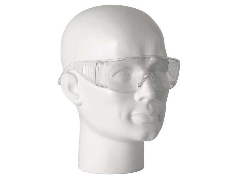 Lunette type "visiteur" en polycarbonate incolore. Rebord latéral et supérieur, assurant une haute protection contre les projections. Peut se porter par dessus des lunettes de vue.
